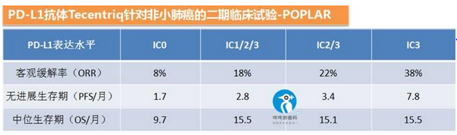 值得注意的是:這個(gè)臨床結(jié)果發(fā)現(xiàn)無論P(yáng)D-L1表達(dá)狀態(tài)如何,使用Tecentriq都會(huì)比使用多西他賽的患者OS更長。之前就有Tecentriq針對非小肺癌的二期臨床POPLAR 研究,發(fā)現(xiàn)PD-L1表達(dá)量越高,Tecentriq的效果越好。IC0代表PD-L1陰性,IC1/2/3代表PD-L1陽性,IC3是強(qiáng)陽性。具體的臨床數(shù)據(jù)如下: