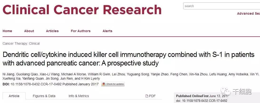首都醫(yī)科大學任軍教授研究團隊在國際期刊Clinical Cancer Research (IF=9.619)上發(fā)表論文,題目為“Dendritic cell/cytokine induced killer cell immunotherapy combined with S-1 in patients with advanced pancreatic cancer: A prospective study”。
