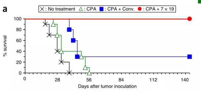 有趣的是,Tamada教授還證明了,單次注射1×10^6個新一代CAR-T細胞,引發(fā)的抗腫瘤效果比注射4×10^6個常規(guī)CAR-T細胞還要好。也就是說,新一代CAR-T細胞的抗實體瘤效果是常規(guī)CAR-T的至少4倍。