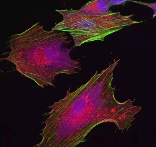 綠色為細(xì)胞骨架,紫色為細(xì)胞核,紅色為細(xì)胞質(zhì)蛋白。