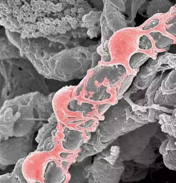 圖中灰色管狀為毛細(xì)血管,哪里有血管哪里就有間充質(zhì)干細(xì)胞(紅)。