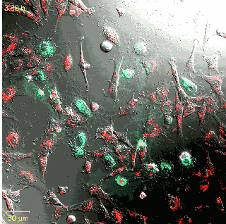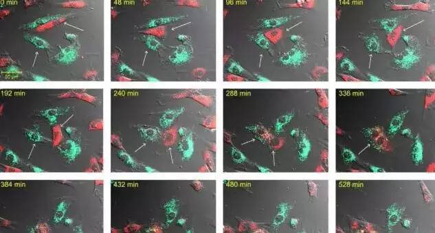 活細(xì)胞染為紅色,死亡的心肌細(xì)胞染為青色,間充質(zhì)干細(xì)胞不斷遷移,箭頭所指部位間充質(zhì)干細(xì)胞逐漸與死亡細(xì)胞融合成為雙核,400分鐘時(shí)死亡的心肌細(xì)胞開始奇跡般地復(fù)活。