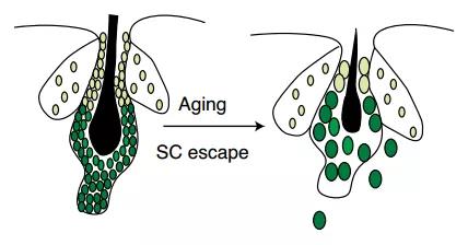 這種情況不算罕見,大約有5.8%衰老毛囊出現(xiàn)了這樣細胞“逃逸”的現(xiàn)象,而且有細胞逃逸的毛囊形態(tài)上明顯也比沒有逃逸的毛囊萎縮得更厲害。