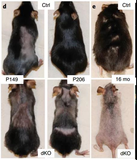 研究者敲除了小鼠的這兩個基因。幸運的是,雙敲除小鼠身體基本上非常健康,壽命與常鼠無益;不幸的是,雙敲除小鼠從5個月大的時候就有了脫發(fā)的跡象,12-16個月大的時候更是基本失去了毛發(fā)。