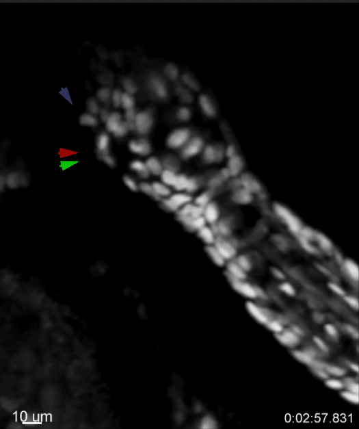 個別細胞能逃離得很遠,比如下圖紅色箭頭標記的細胞就遷移了16μm,對細胞來說可是不短的一段距離了。