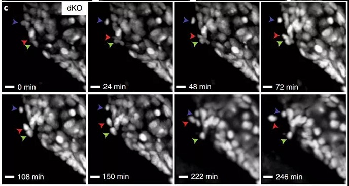 在雙敲除小鼠中,研究者更仔細地觀察到了干細胞逃跑的過程。