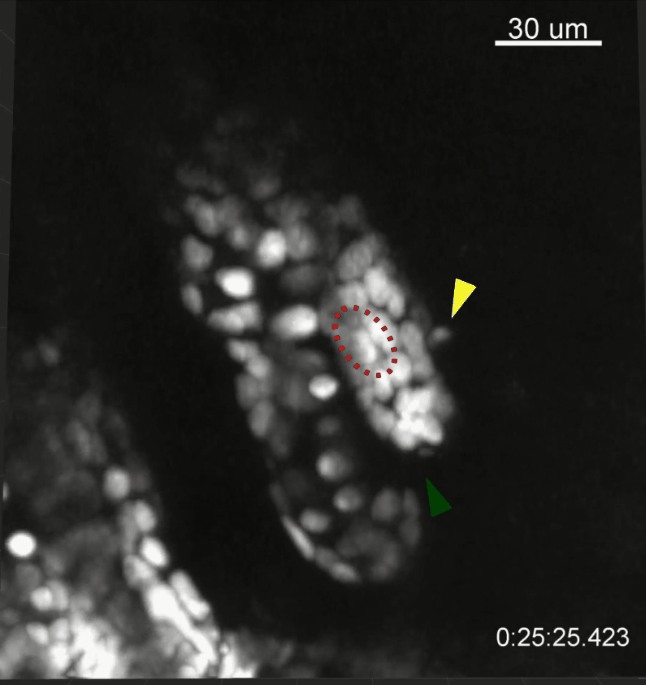 紅色圈內是正在分裂的細胞,黃色箭頭標記的是逃走的干細胞,綠色箭頭標記的是正在凋亡的細胞。