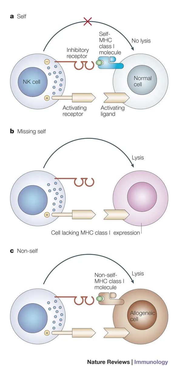 且NK細胞與T細胞不同,它并不需要特異性的抗原致敏,因此不受主要組織相容性復合體(MHC)的限制,而如果癌細胞像躲避T細胞一樣,想通過下調(diào)MHC-I類分子的表達來躲過NK細胞,那就正中免疫系統(tǒng)的下懷了,因為這反而會讓NK細胞察覺到異常并發(fā)起攻擊,即所謂的丟失自我(Missing-self)識別假說[3]。