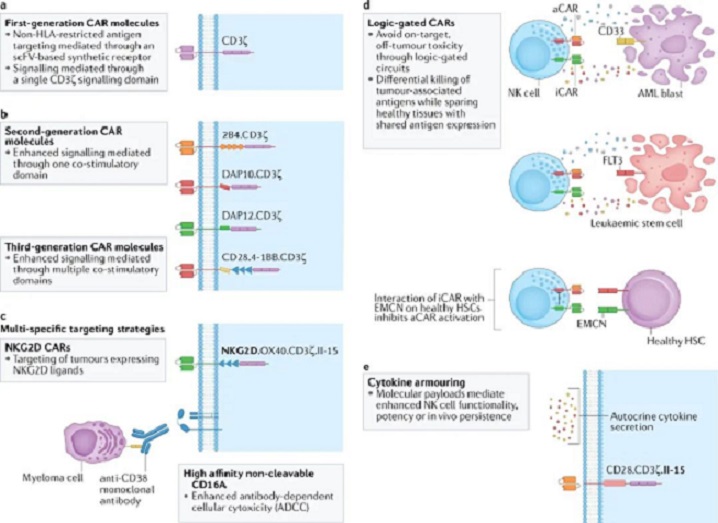 嵌合抗原受體(CAR)能修飾T細胞,搞出大獲成功的CAR-T療法,那也可以把NK細胞“CAR一下”,讓NK細胞能夠識別癌細胞表面抗原,而且與CAR有關的抗原非依賴性信號(tonic signaling),也可能更好地激活NK細胞的抗腫瘤活性。