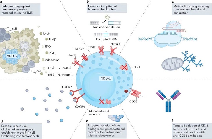 不過有研究發(fā)現(xiàn),持續(xù)外源性補充細胞因子,可能會導致NK細胞的“細胞因子成癮性”,不利于維持抗腫瘤活性。目前關注度較高的方法,是通過對NK細胞的基因進行改造,使其具備自分泌特定細胞因子的能力,這樣不僅能激活NK細胞自身,還可能影響腫瘤微環(huán)境中其它類型的免疫細胞,來個一石多鳥。