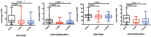研究結(jié)果顯示,NK細(xì)胞輸注后1周和4周,表現(xiàn)為CD28-KLRG1+CD4+ T細(xì)胞和CD8+ T細(xì)胞顯著減少。這代表T細(xì)胞衰老指標(biāo)顯著得到改善。