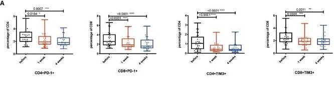 NK細(xì)胞輸注后1周和4周,流式細(xì)胞術(shù)分析得到的PD-1TIM-3 T細(xì)胞的百分比