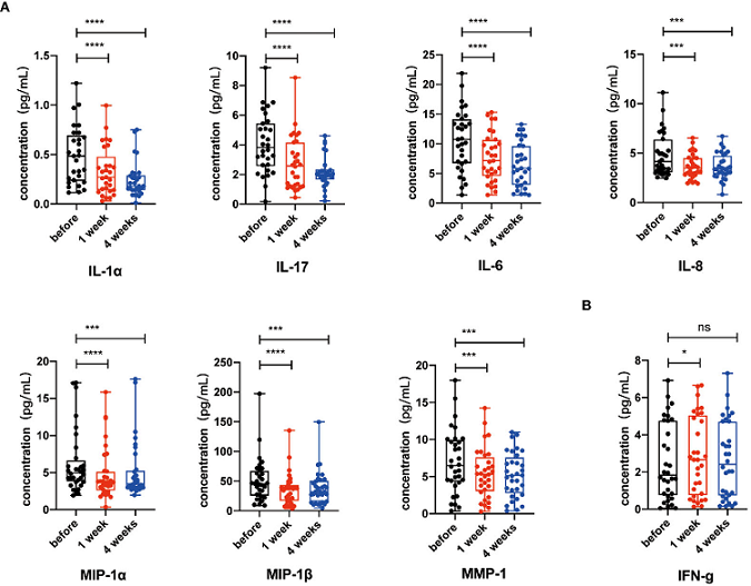 研究結(jié)果表明,NK細(xì)胞輸注顯著降低了包括IL-6、IL-8、IL-1α、IL-17、MIP-1αMMP-1β以及MMP1在內(nèi)的SASP相關(guān)因子,進(jìn)一步提示NK細(xì)胞輸注能夠有效改善衰老指標(biāo)。