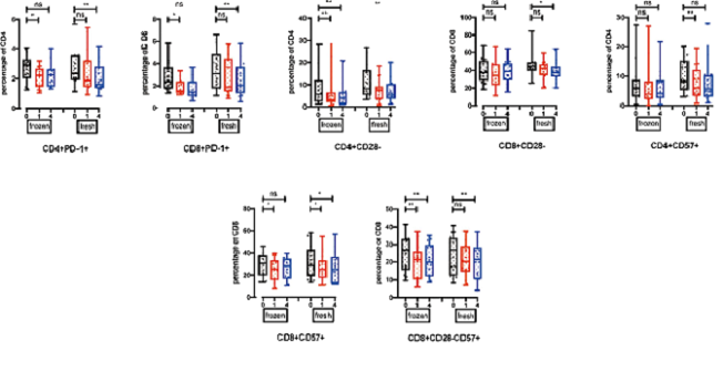 結(jié)果表明,凍存PBMC或新鮮PBMC擴(kuò)增NK有類似改善T細(xì)胞衰竭和衰老的效果。
