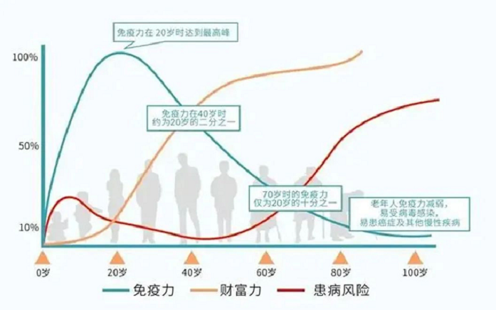 △人體免疫機(jī)能從20歲后不斷下降,從40歲開始,患病患癌風(fēng)險(xiǎn)概率逐漸增加