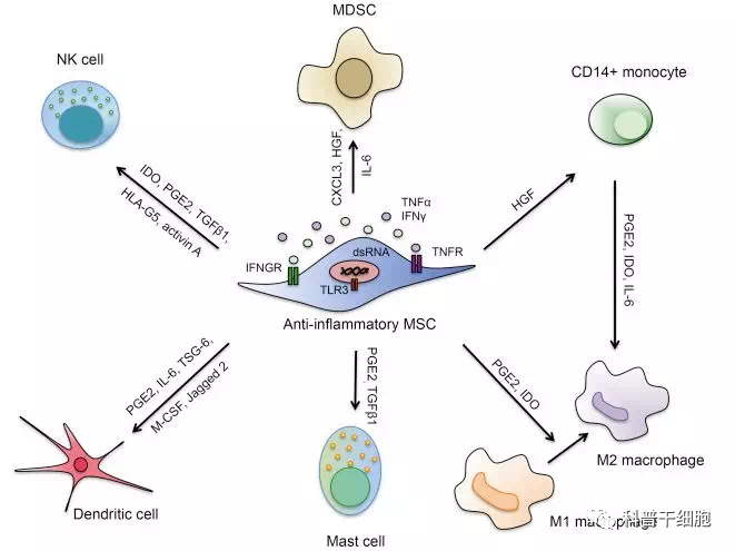 △干細(xì)胞調(diào)控免疫系統(tǒng)示意圖如間充質(zhì)干細(xì)胞在TNFα, IL-1α, IL-1β等促炎因子的刺激下,所分泌的趨化因子(CCL5、CXCL10),生長(zhǎng)因子(TGF-β、HGF),細(xì)胞因子(IDO)以及抗炎小分子(PGE2),能抑制炎癥反應(yīng)及炎癥相關(guān)細(xì)胞TH1和TH17、漿細(xì)胞、促炎性M1巨噬細(xì)胞、自然殺傷性細(xì)胞及中性粒細(xì)胞的遷移、增殖。