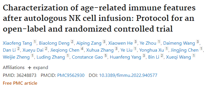 2022年9月,上海長征醫(yī)院輸血科、上海交通大學免疫學研究所等單位聯(lián)合在《Frontiers in Immunology》上發(fā)表了一篇名為“Characterization of age-related immune features after autologous NK cell infusion: Protocol for an open-label and randomized controlled trial”的研究結(jié)果表明,自體NK細胞能夠顯著改善T細胞衰老和耗竭